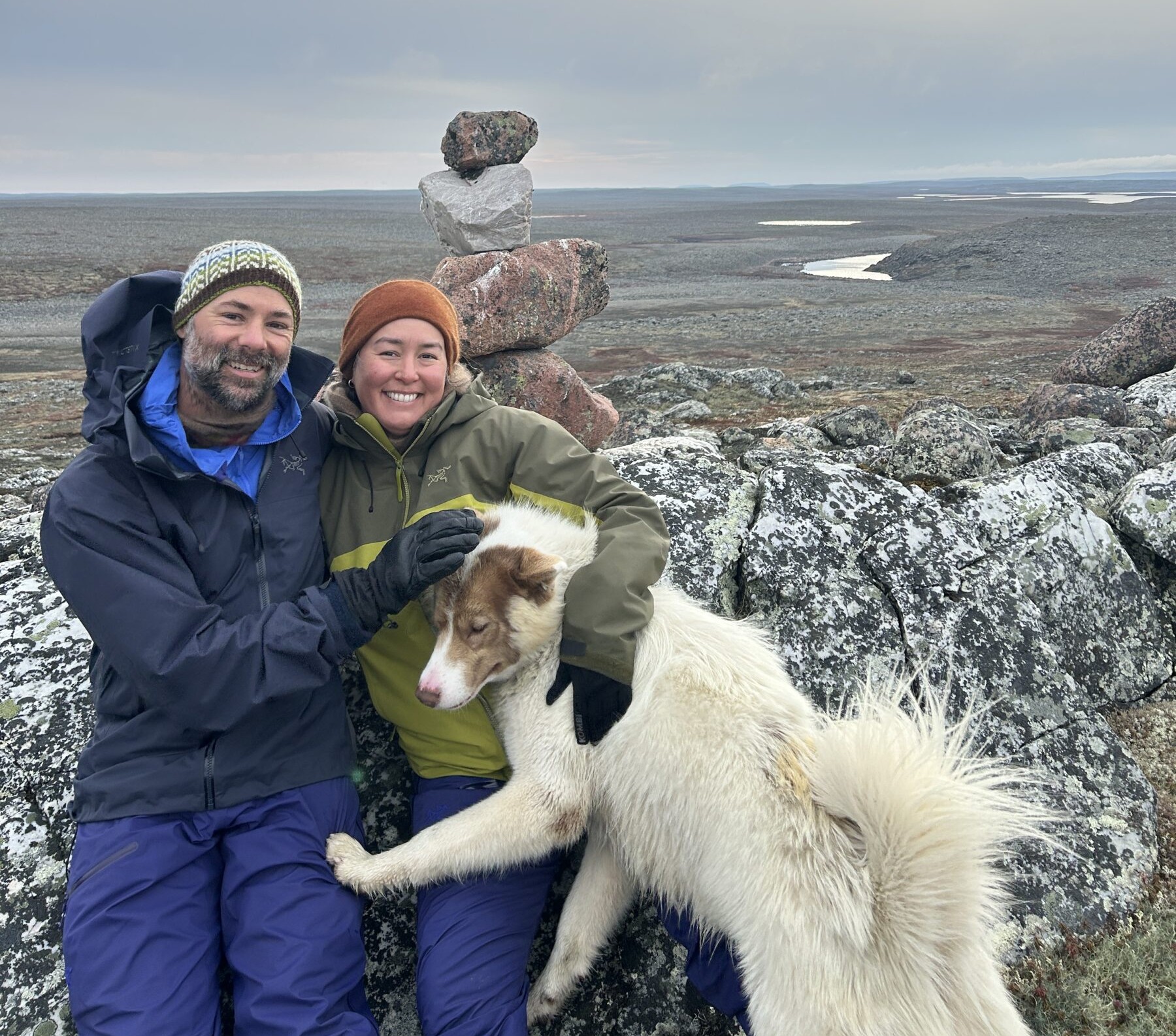 | Erik Reid and Gayle Uyagaqi Kabloona pose for a photo with their dog Tempe in front of one of many inuksuit the group used to guide their journey. (Photo courtesy of Gayle Uyagaqi Kabloona) |