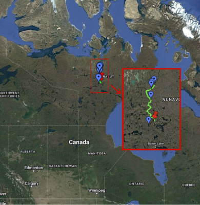 The route started in Back River, approximately 200 kilometres north of Agnico Eagle Mines Ltd.’s Meadowbank Mine. They proceeded south for 23 days and reached the family’s traditional winter caribou hunting spot called Amarulik, which means “the place where there are wolves.”