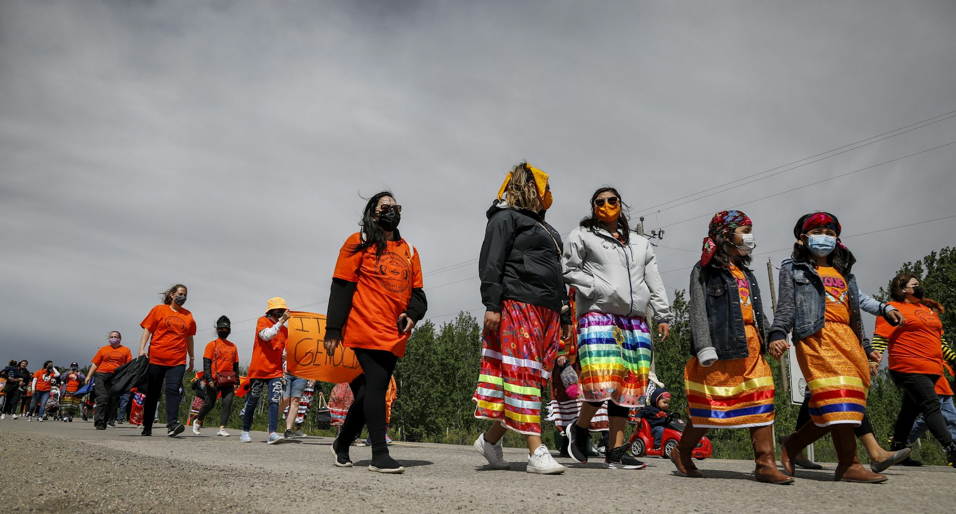 | Members of the Tsuut'ina Nation take part in a silent march in Calgary in memory of the 215 unmarked graves found at Kamloops, B.C. THE CANADIAN PRESS/Jeff McIntosh |